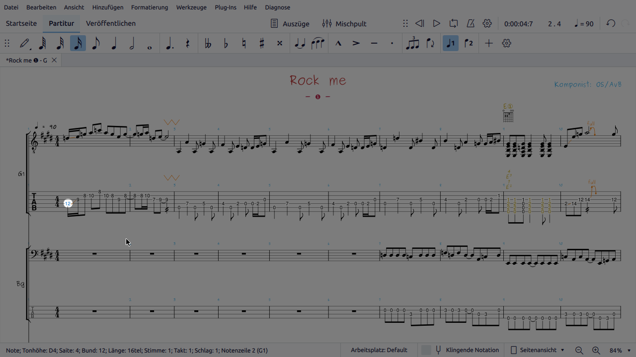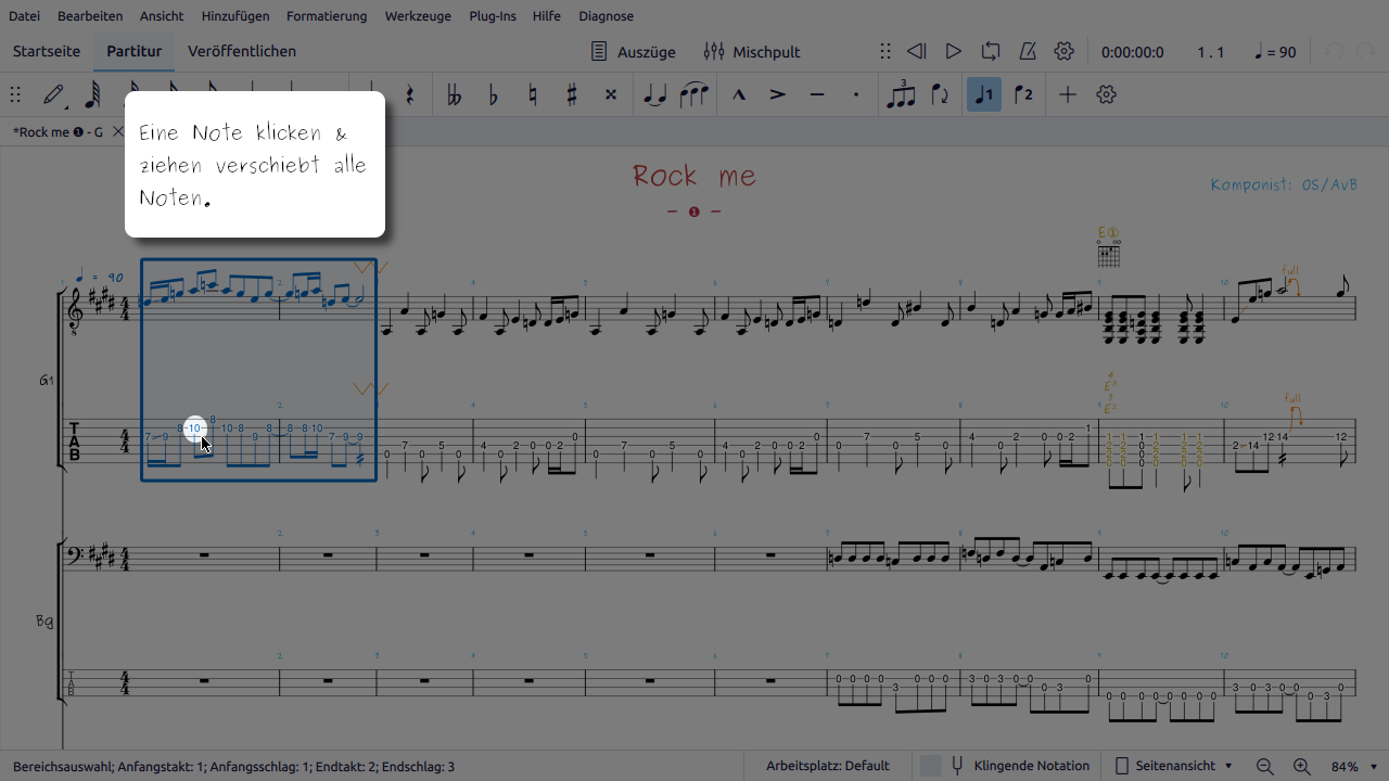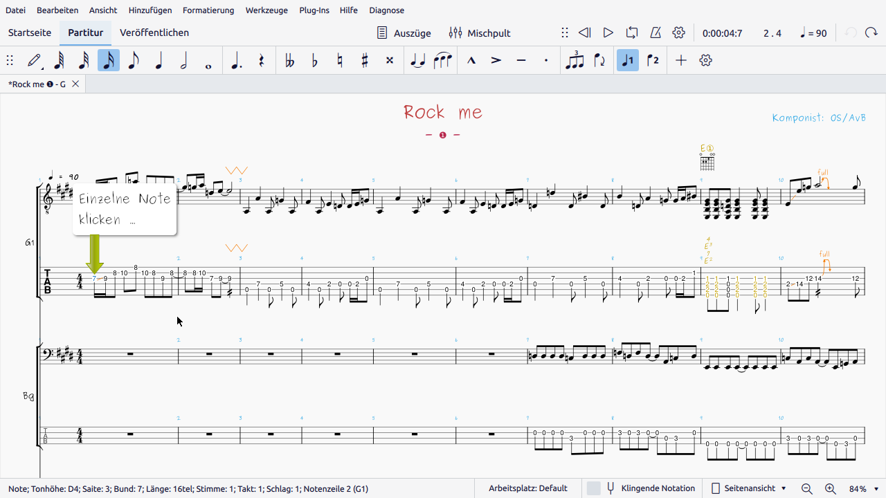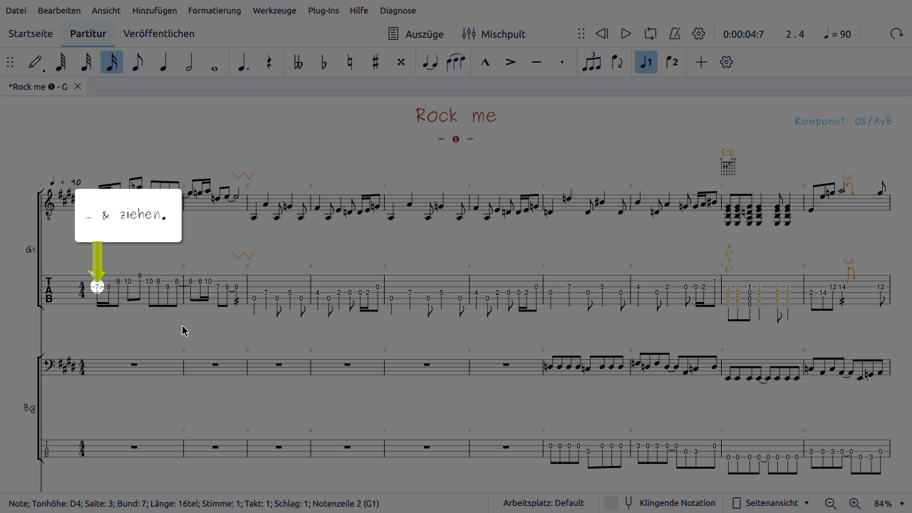 Die Bedienungsschritte (MS 4.2) zum Verschieben von Noten in der Tabulatur in ca. 1 Minute:
